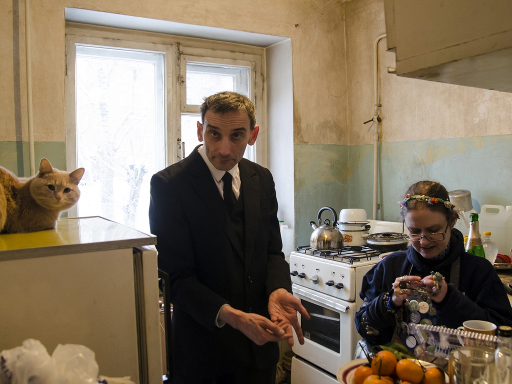 Роман cлева, с плакатом «Земля — крестьянам! Фабрики — рабочим! Печать — поэтам!».