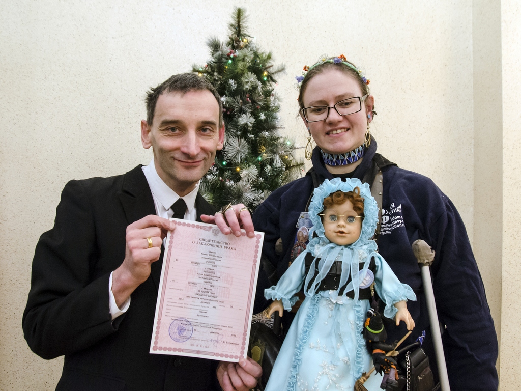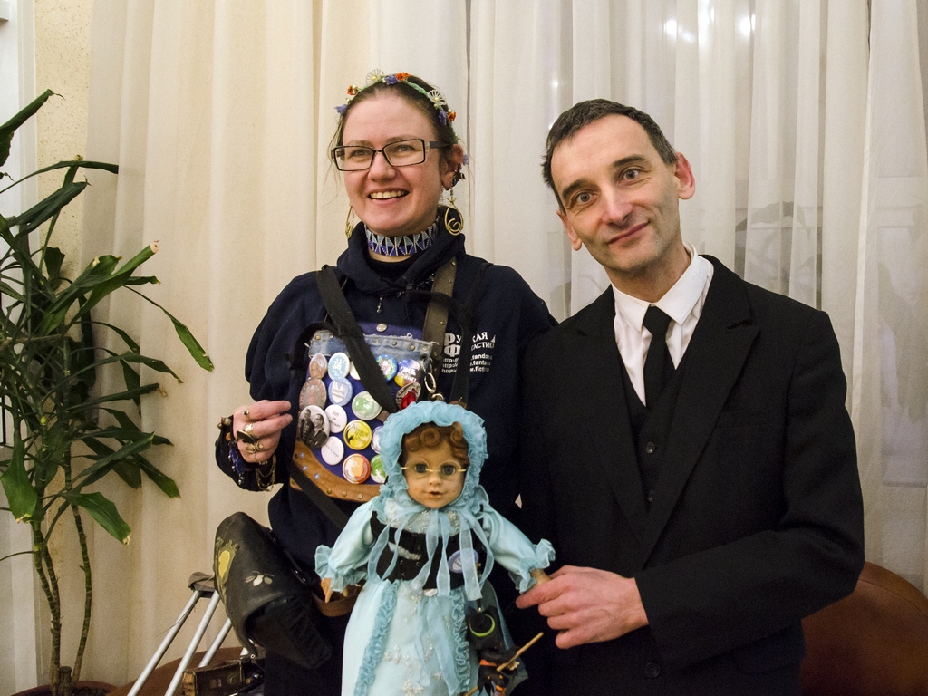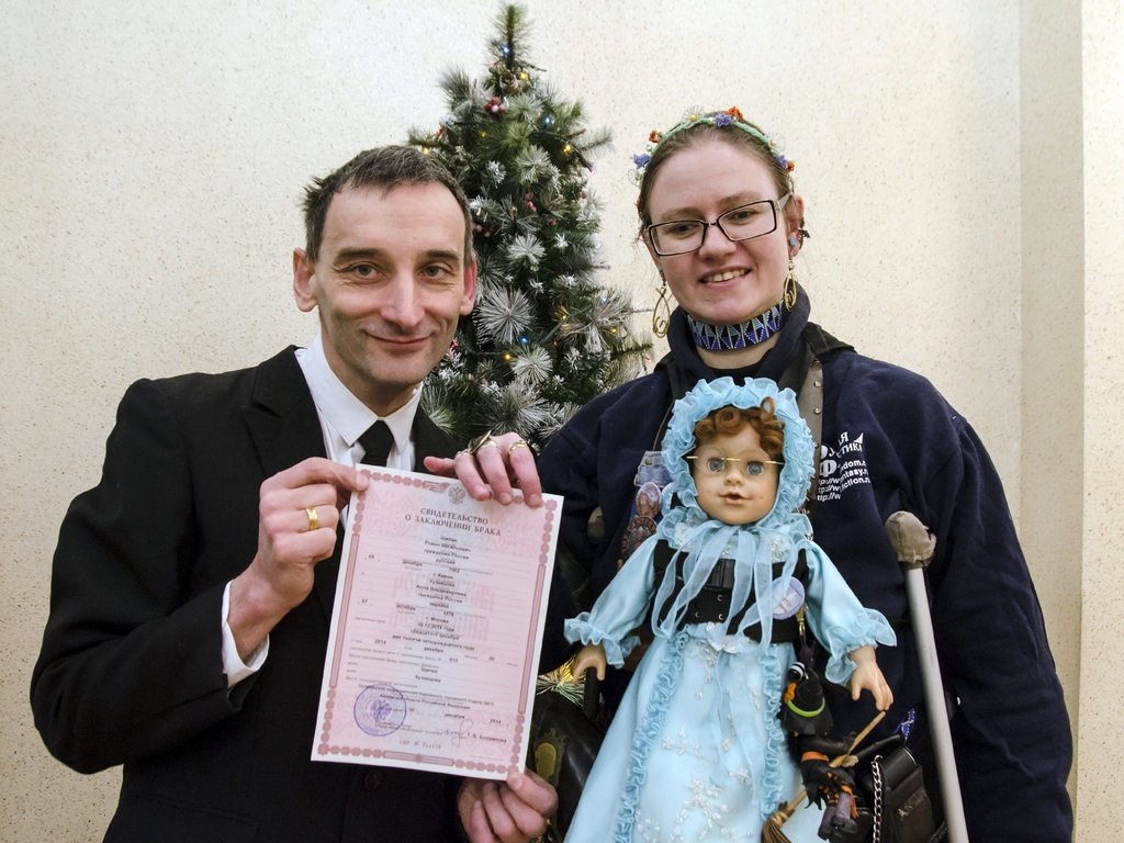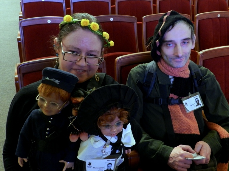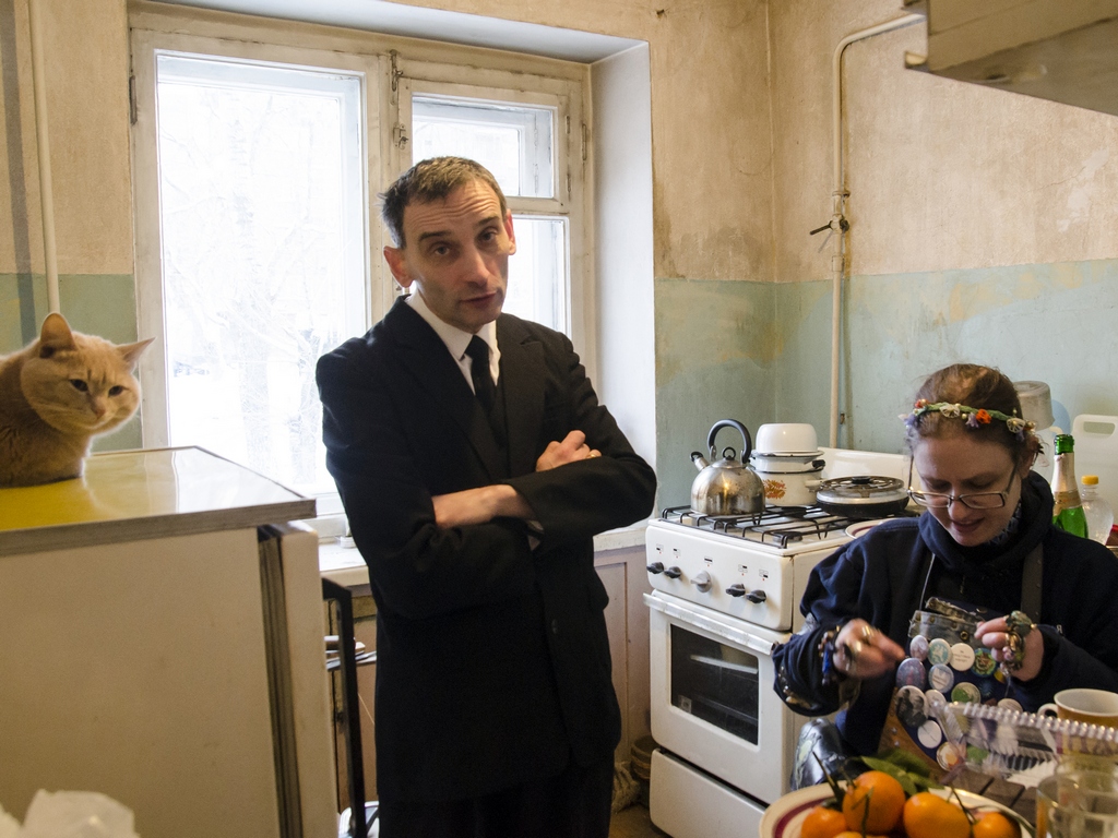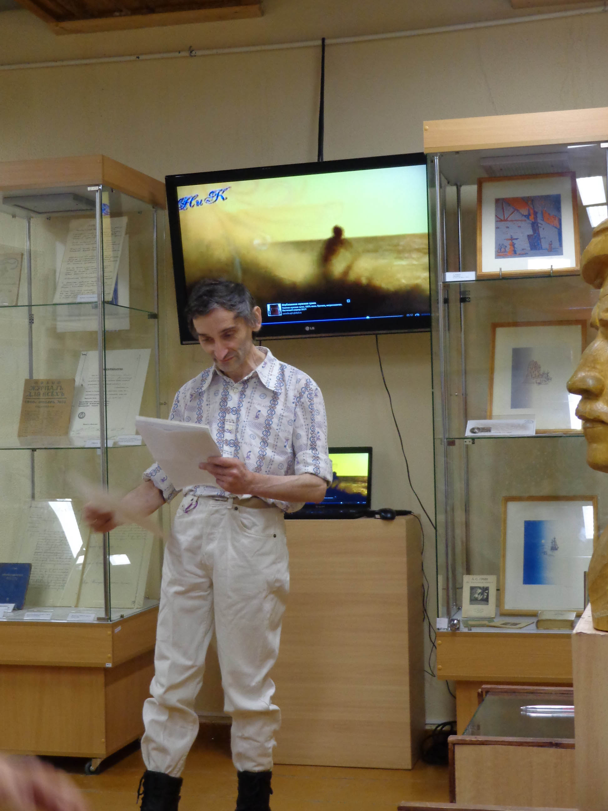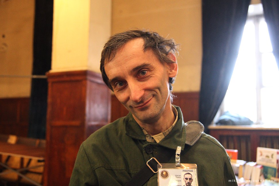 Роман cлева, с плакатом «Земля — крестьянам! Фабрики — рабочим! Печать — поэтам!».