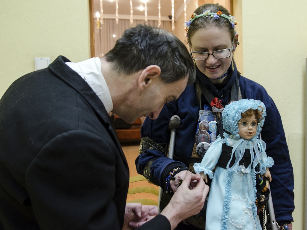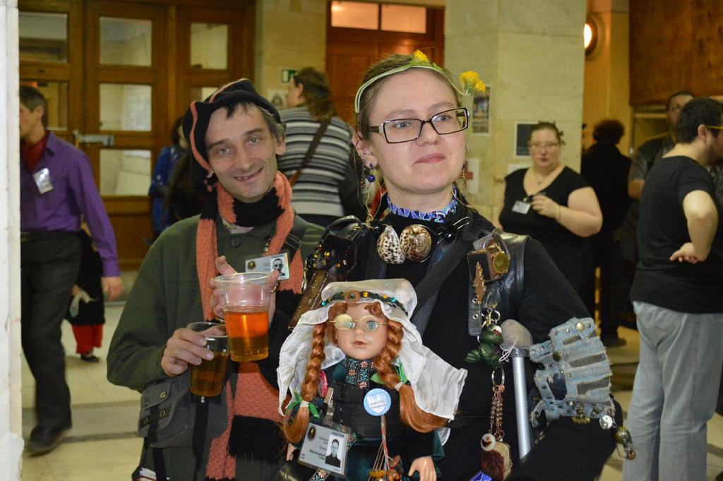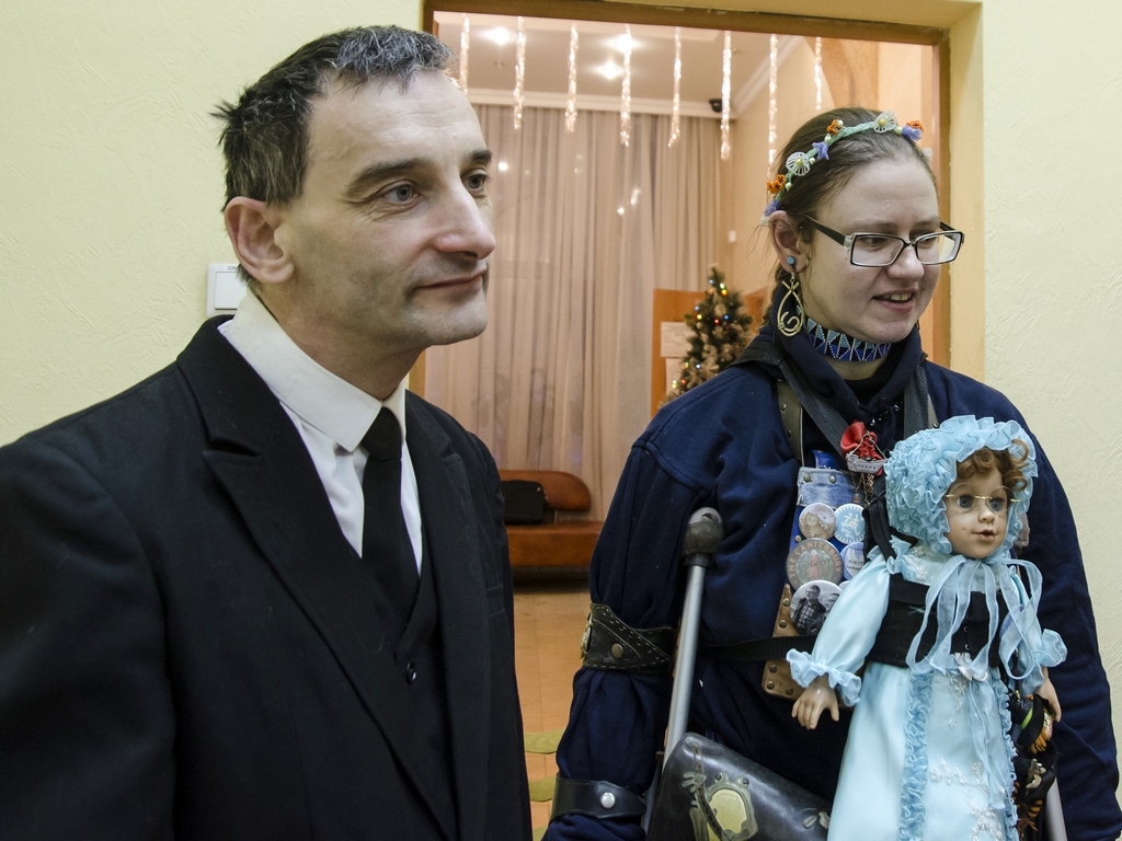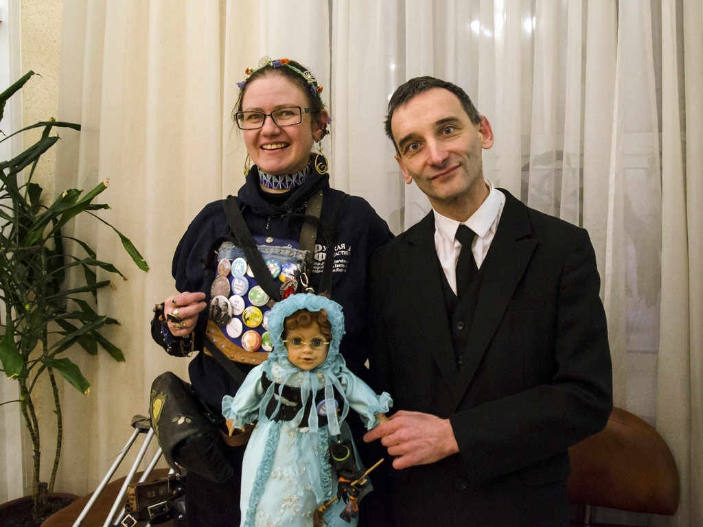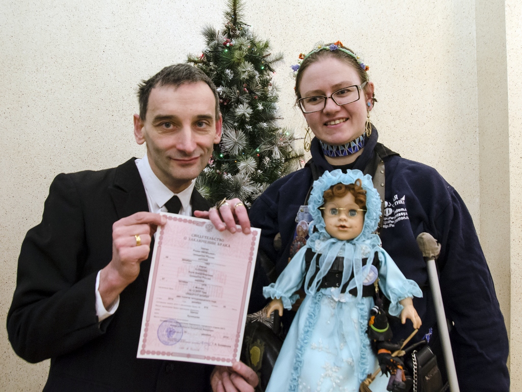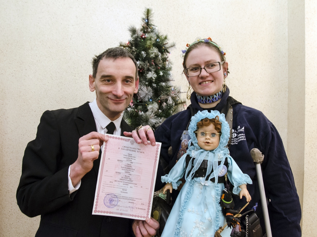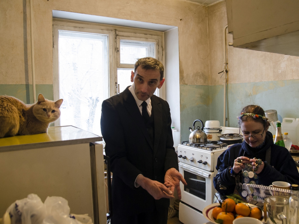 Роман cлева, с плакатом «Земля — крестьянам! Фабрики — рабочим! Печать — поэтам!».